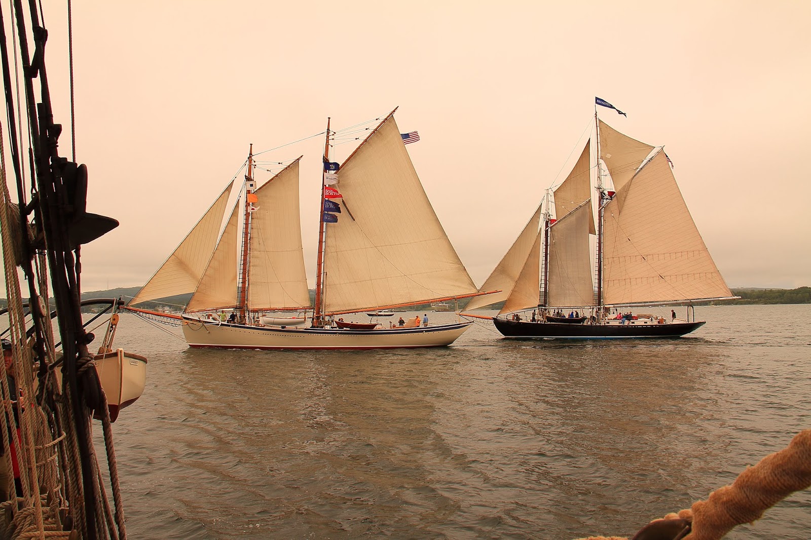 American Eagle and Nathaniel Bowditch pass across the bow of Angelique off Camden Maine.